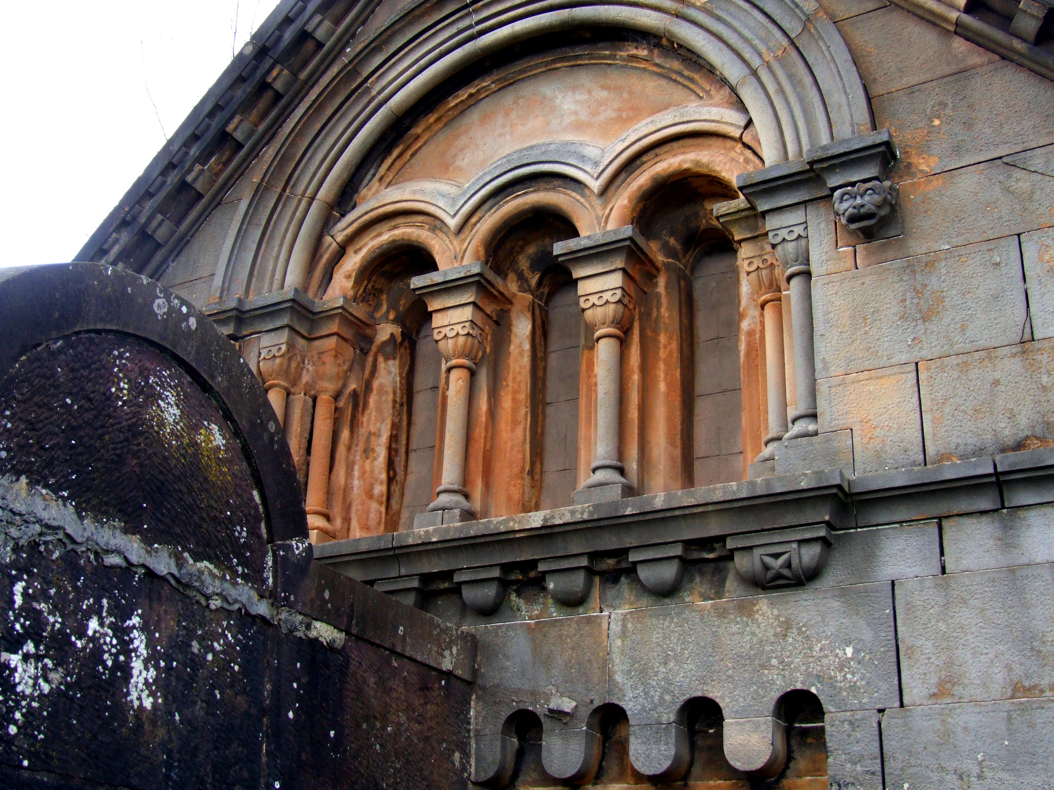 It is built of sandstone ashlar and has zoomorphic and figurative sculptures - strange faces that peer from the parapets.